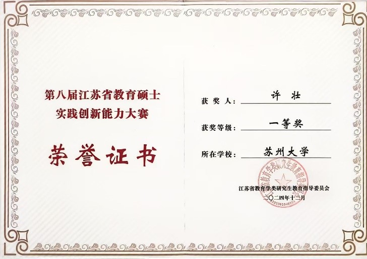 学生许壮在江苏省教育硕士实践创新能力大赛中荣获一等奖